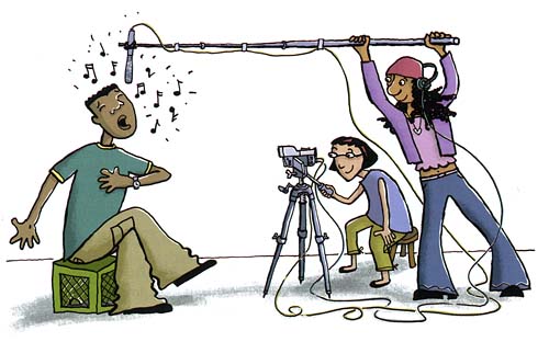 Four pals team up to try their hand at home video-making. Ink drawn and coloured digitally. Art by Martha Newbigging for "Attack of the Killer Video Book: Tips and Tricks for Young Directors" published by Annick Press. Written by Mark Shulman and Hazlitt Krog. TAKE 2: Revised and updated in 2012.