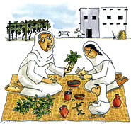 The Senior Homemaker teaches her granddaughters how to cook, bake, tend a vegetable garden, spin yarn, weave cloth, twist plant fibres into rope, and milk goats and sheep.